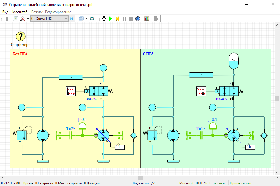 Данный проект демонстрирует возможности библиотеки "Гидросистемы" совместно с библиотекой "Механика" для моделирования гидропривода с разомкнутой схемой циркуляции с использованием пневмогидравлического аккумулятора (ПГА) и без него.