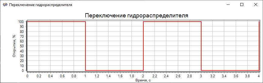 Для остановки и запуска гидромотора используется блок "Гидравлический пропорциональный распределитель 2/2", обеспечивающий подвод жидкости к гидромотору согласно управляющему сигналу прямоугольной формы, который определяется свойствами блока "Меандр". При срабатывании данного распределителя в длинной линии, соединяющей насос с гидромотором, возникают колебания расхода и давления, которые могут быть снижены за счет установки блока "Пневмогидравлический аккумулятор".