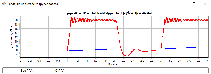 Для гидросистемы с установленным ПГА при закрытии распределителя 2/2 в момент времени 1 с давление на конце трубопровода (и в гидравлической полости ПГА) повышается плавно за счет податливости газа. В результате расход жидкости в трубопроводе не уменьшается, происходит заполнение гидравлической полости ПГА. Таким образом, установка ПГА в гидросистеме способствует снижению колебаний ее параметров при управляющих и возмущающих воздействиях.