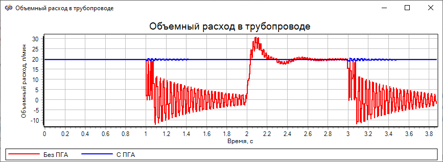 Полученные результаты показывают, что при что при резком закрытии распределителя 2/2 в момент времени 1 с происходит повышение давления на конце трубопровода и снижение объемного расхода жидкости в трубопроводе для системы без учета ПГА. Рост давления продолжается до момента достижения давления настройки предохранительного клапана. При этом наблюдаются колебания параметров потока с частотой около 29 Гц, которая соответствует частоте первой гармоники для трубопровода длиной 10 м с закрытым концом. В период времени с 1-ой по 2-ую секунды происходит диссипация колебательной энергии, и амплитуды колебаний давления и расхода снижаются ввиду наличия гидравлического сопротивления трубопровода. Открытие распределителя 2/2 на 2-ой секунде приводит к снижению давления в трубопроводе и увеличению расхода через него. Процесс сопровождается забросом по давлению и расходу, что связано с инерционностью нагрузки, присоединенной к валу гидромотора. Начиная с 3-ей секунды, процесс повторяется.