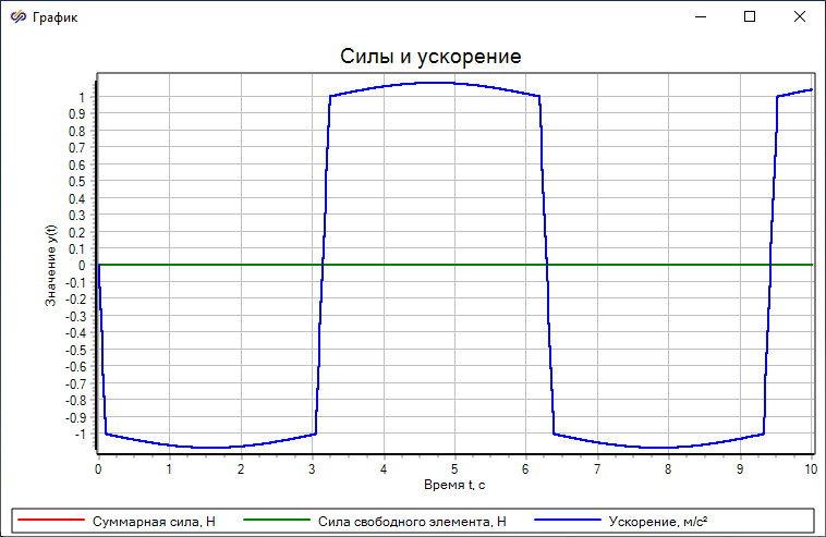 Блоки "Источник силы" моделируют действие внешних сил на безынерционный элемент. Значение одной силы меняется по гармоническому закону, а значение второй нелинейно зависит от ускорения движения и вычисляется путем интерполяции.