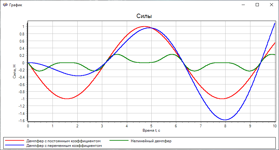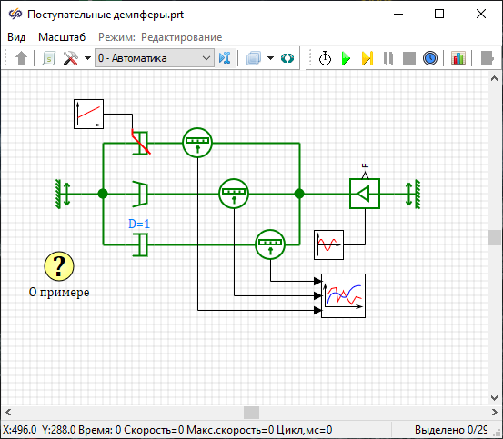 Данный проект демонстрирует возможности библиотеки "Механика" по моделированию функционирования линейных и нелинейных демпферов при различной скорости движения.
