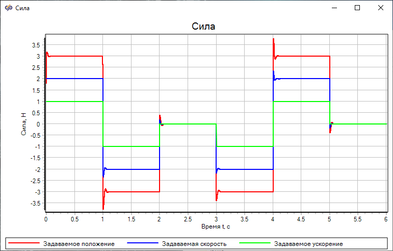 При ступенчатом изменении ускорения, рассчитывающегося автоматически при задании профиля скорости и положения, графики сил имеют дребезг, вызванный погрешностями дифференцирования.