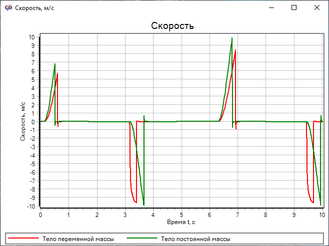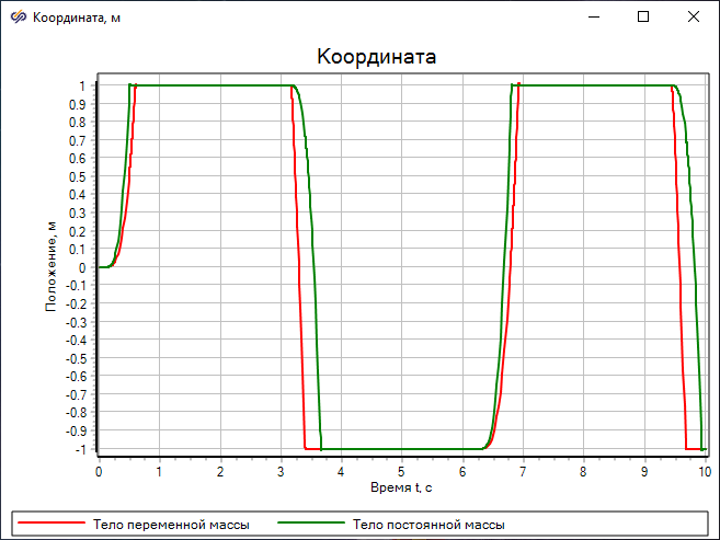 Масса одного из тел изменяется в ходе моделирования, ее значение равно сумме константы и гармонического сигнала.