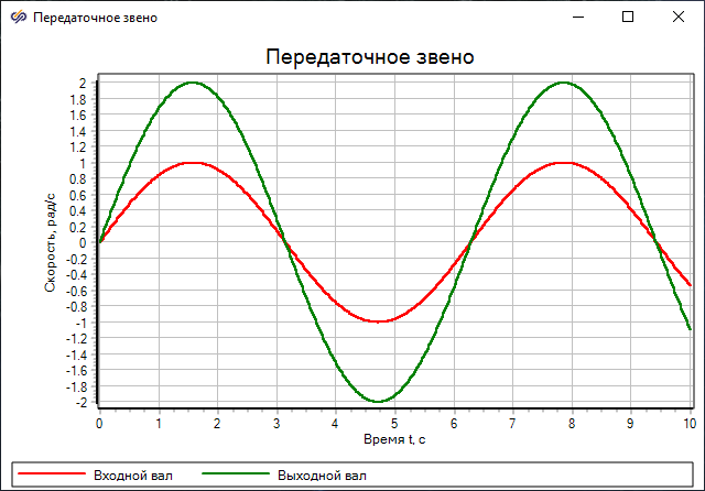 Блок "Передаточное звено" считывает скорость движения ведущего вала и задает вращение ведомого вала со скоростью в 2 раза больше скорости ведущего вала.