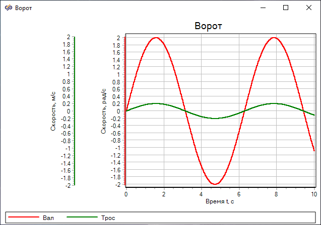 Блок "Ворот" моделирует преобразование вращательного движения в поступательное. Блок считывает угловую скорость вала и формирует поступательное движение троса, сматывающегося с барабана радиусом 0.1 м.