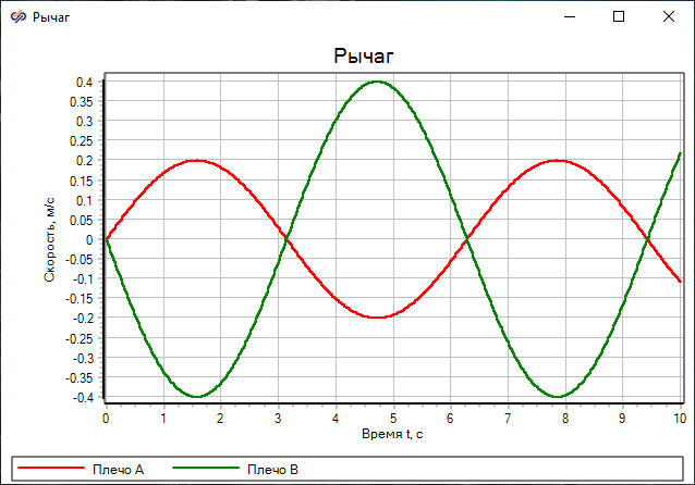 Блок "Рычаг" моделирует рычажный механизм, у которого центральный шарнир C закреплен на неподвижной заделке, а длина плеч AC и BC отличается в 2 раза. Блок считывает линейные положения шарниров A и C и рассчитывает соответствующее линейное положение шарнира B.