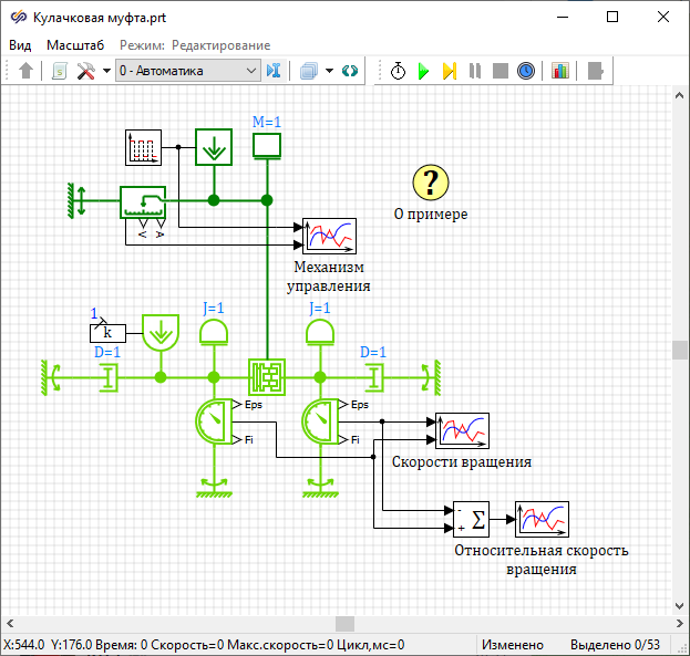 Данный проект демонстрирует возможности библиотеки "Механика" по моделированию зацепления и расцепления кулачковой муфты.