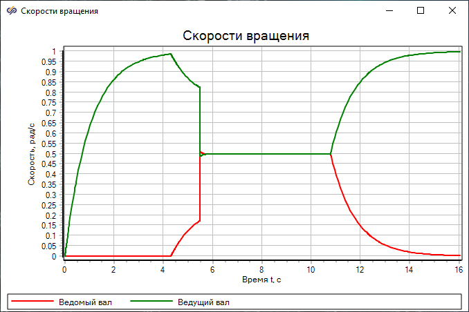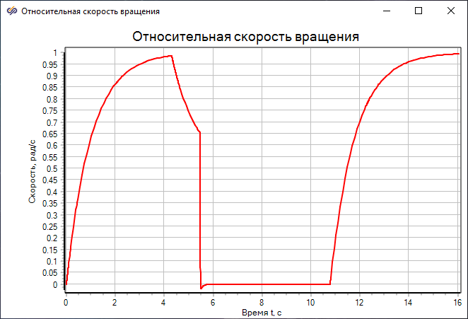 Под действием отрицательной управляющей силы механизм управления остается в крайнем положении, соответствующем полному расцеплению. Ведущий вал под действием крутящего момента разгоняется до скорости 1 рад/с.