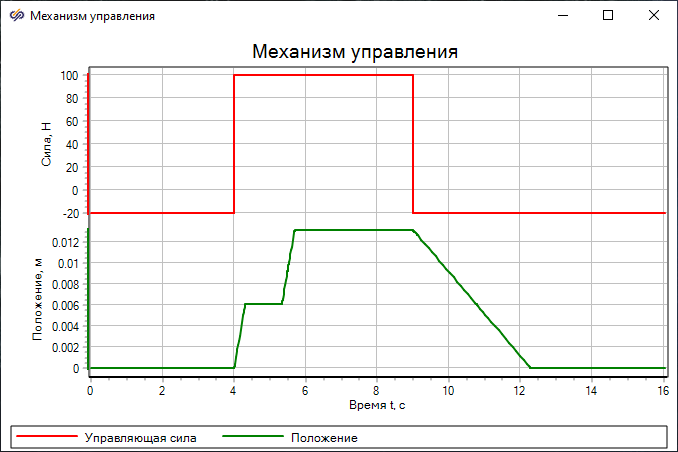 Блок "Масса" моделирует механизм управления муфтой. Блок "Источник силы" позволяет приложить к механизму управления управляющую силу, значение которой формируется блоком "Меандр".
