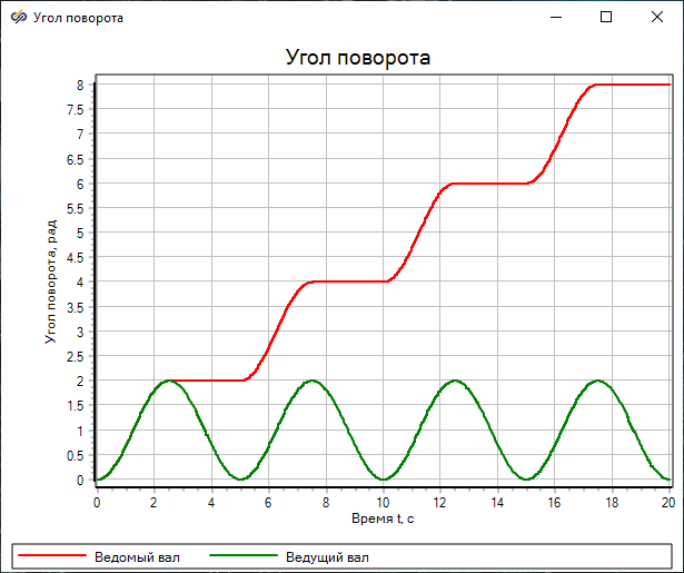Блок "Однонаправленная муфта" передает крутящий момент только при положительной скорости вращения ведущего вала, а при отрицательной скорости вал нагрузки остается неподвижным под действием трения. Таким образом за один период вращения ведущего вала ведомый вал увеличивает свой угол поворота на 2 радиана.