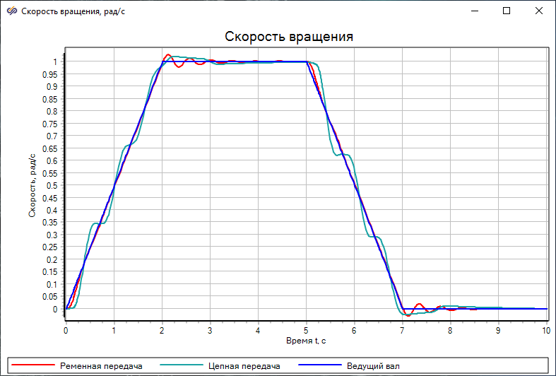 График скорости ведомого вала ременной передачи имеет вид затухающих колебаний, вызванных упругостью ремня.
