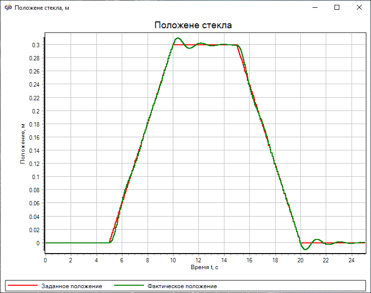 Блок "Задатчик профиля вращательного движения" формирует закон изменения угла поворота ведущего шкива. Вращение ведущего шкива вызывает движение троса и перемещение стекла.