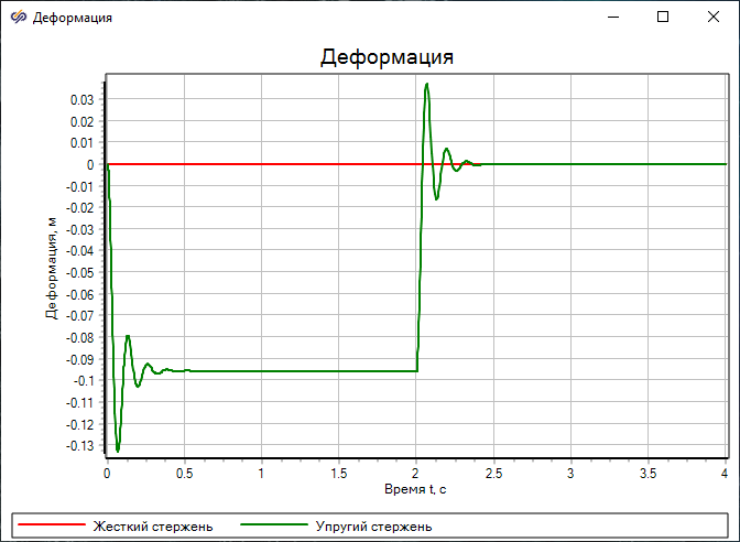 Прикладываемая сила равна 100 Н и в момент времени 2 с ступенчато изменяет значение на нулевое. Под действием силы наблюдается продольная деформация упругого стержня, представляющая собой затухающие колебания. Деформация жесткого стержня равна нулю вне зависимости от передаваемой силы.