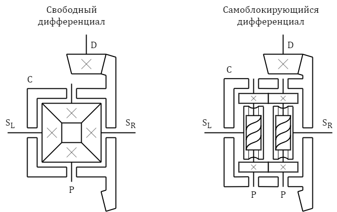 Свободный дифференциал состоит из левой и правой полуосей SL и SR с установленными на них коническими шестернями-звездами, корпуса C, конических шестерней-планет P и ведущего вала D с конической шестерней, входящей в зацепление с конической шестерней, установленной на корпусе.