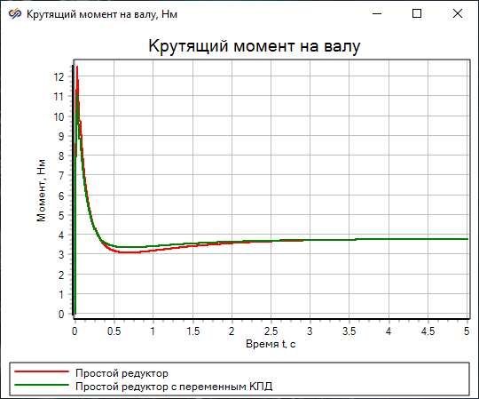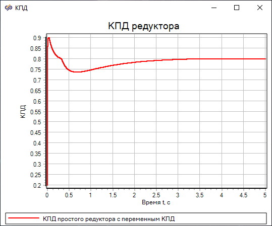 КПД редуктора имеет значение 0.8 при номинальном моменте 3.75 Нм. В момент начала вращения крутящий момент превышает номинальный из-за сил трения страгивания, из-за этого КПД имеет значение выше 0.8, а потери ниже, чем потери в редукторе с постоянным КПД.