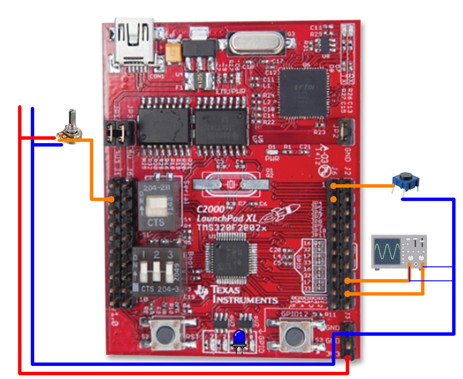 После подключения запустить плату и запустить осциллограф. При нажатии на кнопку светодиод будет затухать. При вращении переменного резистора будет изменяться сопротивление, вследствие чего на осциллографе будет изменяться скважность ШИМ.