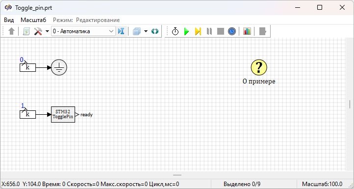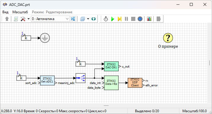 Проект «TimerShed.prt» (Рисунок 1), посылает сигнал прерывания таймеров для запуска проектов «ADC_DAC.prt» (Рисунок 2) и «Toggle_pin.prt» (Рисунок 3). Выполнение алгоритма проекта «Toggle_pin.prt» (Рисунок 3) будет происходить по вызову сигнала прерывания переполнения TIMER1. Выполнение алгоритма проекта «ADC_DAC.prt» (Рисунок 2) будет происходить по вызову сигнала прерывания переполнения TIMER2. В результате запуска проекта «Toggle_pin.prt» (Рисунок 3) микроконтроллер STM32 будет переключать значение пина «13» порта «D» один раз в секунду, в результате запуска проекта «ADC_DAC.prt» (Рисунок 2) с высокой частотой дискретизации микроконтроллер STM32 будет опрашивать вход АЦП, передавать полученные значения по протоколу UDP на персональный компьютер с SimInTech и дублировать эти значения на ЦАП микроконтроллера STM32 для анализа полученных сигналов с помощью осциллографа.