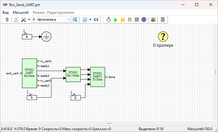 Для запуска примера требуется подготовить проект «Rcv_Send_UART.prt» (Рисунок 1) к кодогенерации, сгенерировать