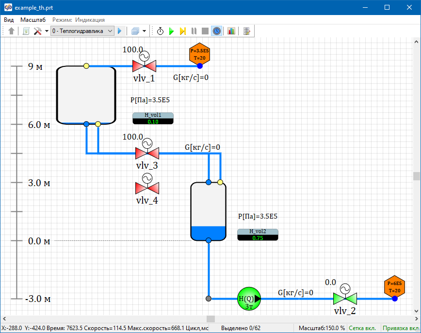 На схеме размещены баки, соединяющие их трубопроводы, внутренние узлы, отверстия в баках, запорная арматура, насос и граничные узлы. В качестве топлива использовалась вода (для примера тип жидкости не принципиален).