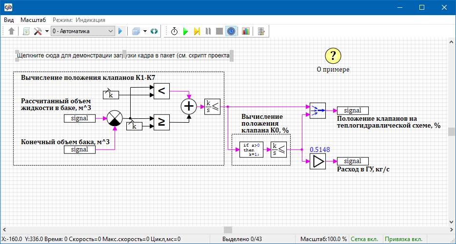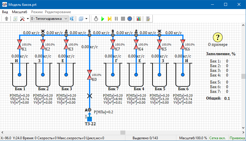 В примере показана модель заполнения топливных баков. Пакет состоит из проекта теплогидравлики, содержащего расчетную технологическую схему и проекта автоматики, содержащего алгоритмы вычисления положения клапанов. При достижении заполнения каждого бака 98-99% от полного объема бака, соответствующий клапан закрывается. После закрытия всех клапанов на баки, закрывается общий клапан, подающий топливо в коллектор.