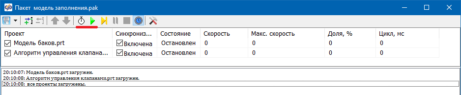 С помощью него комплексная модель может быть запущена на расчет. Для этого выполните однократный щелчок левой кнопкой мыши сначала по кнопке «Инициализировать все», а затем по кнопке «Запустить все» (подчеркнуты на рисунке).