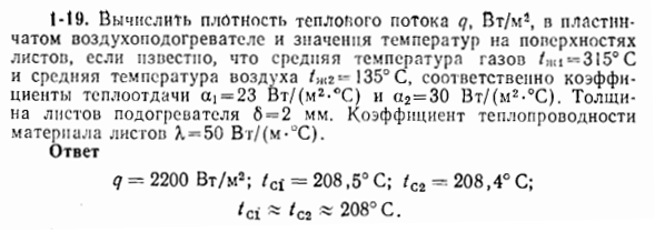 Вычислить плотность теплового потока q, Вт/м2, в пластинчатом воздухоподогревателе и значение температур на поверхностях листов, если известно, что средняя температура газов tж1=315°С и средняя температура воздуха tж2=135°С, соответственно коэффициенты теплоотдачи α1 = 23 Вт/(м2∙°С) и α2 = 30 Вт/(м2∙°С). Толщина листов подогревателя δ=2мм. Коэффициент теплопроводности материала листов λ = 50 Вт/(м∙°С).