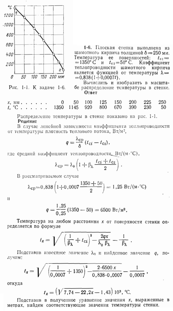 Плоская стенка выполнена из шамотного кирпича толщиной δ=250 мм. Температура ее поверхностей: tст1=1350°С и tст2=50°С. Коэффициент теплопроводности шамотного кирпича является функцией от температуры λ(t) = 0,838∙(1+0,0007∙t). Вычислить и изобразить в масштабе распределение температуры в стенке.