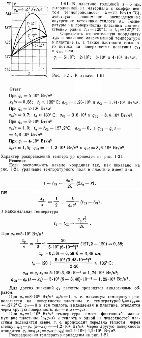 Определить относительную координату x0/s и значение максимальной температуры в пластине t0, а также плотности теплового потока на поверхности пластины qc1 и qc2 если qv= 5∙107; 2∙107; 8∙106 и 4∙106 Вт/м3.