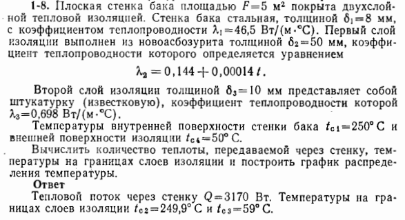 Вычислить количество теплоты, передаваемой через стенку, температуры на границах слоев изоляции и построить график распределения температуры.