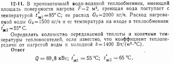 В противоточный водо-водяной теплообменник, имеющий площадь поверхности нагрева 2м2, греющая вода поступает с температурой t’ж1=85℃; ее расход G1=2000 кг/час. Расход нагреваемой воды G2=1500 кг/час и ее температура на входе в теплообменник t’ж2=25℃. Определить количество передаваемой теплоты и конечные температуры теплоносителей, если известно, что коэффициент теплопередачи от нагретой воды к холодной k=1400 Вт/ (м2∙℃).