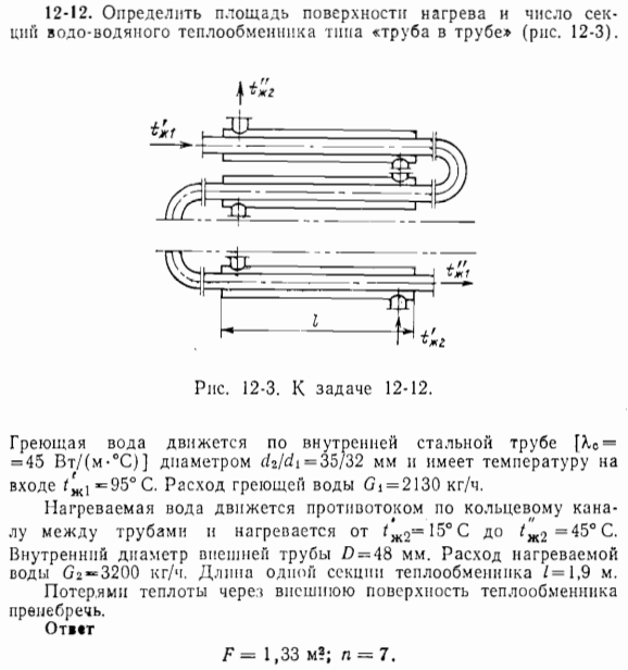 Определить площадь поверхности нагрева и число секций водо-водяного теплообменника типа "труба в трубе". Греющая вода движется по внутренней стальной трубе [λc=45 Вт/(м∙℃)] диаметром d2/d1=35/32 мм и имеет температуру на входе t’ж1=95℃. Расход греющей воды G1=2130 кг/ч. Нагреваемая вода движется противотоком по кольцевому каналу между трубами и нагревается от t’ж2=15℃ до t’’ж2=45℃. Внутренний диаметр внешней трубы D=48 мм. Расход нагреваемой воды G2=3200 кг/ч. Длина одной секции теплообменника l=1,9 м. Потерями теплоты через внешнюю поверхность теплообменника пренебречь.