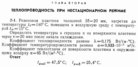 Резиновая пластина, толщиной 2δ=20мм, нагретая до температуры t0=140°C, помещена в воздушную среду с температурой tm=15°C. Определить температуры в середине и на поверхности пластины через τ=20 мин после начала охлаждения. Коэффициент теплопроводности резины λ=0,175 Вт/(м·°С). Коэффициент температуропроводности резины a=0,833·10-7 м2/с. Коэффициент теплоотдачи от поверхности пластины к окружающему воздуху α=65 Вт/(м2·°С).