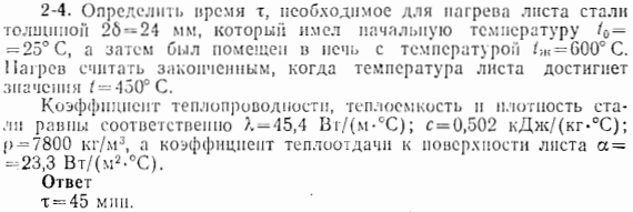 Определить время τ, необходимое для нагрева листа стали толщиной 2δ=24 мм, который имел начальную температуру t0=25°С, а затем был помещен в печь с температурой tж=600°С. Нагрев считать законченным, когда температура листа достигнет значения t=450°С. Коэффициент теплопроводности, теплоемкости и плотности стали равны соответственно, λ=45,4 Вт/ (м∙°С), с=0,502 кДж/(кг∙°С), ρ=7800 кг/м3, а коэффициент теплоотдачи от поверхности листа α=23,3 Вт/(м2∙°С).