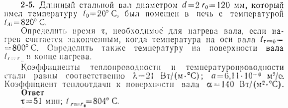 Длинный вал диаметром d=2∙r0=120 мм, который имел температуру t0=20°С, был помещен в печь с температурой tж=820°С. Определить время τ, необходимое для нагрева вала, если нагрев считается законченным, когда температура на оси вала tr=0=800°С. Определить также температуру на поверхности вала tr=r в конце нагрева. Коэффициенты теплопроводности и температуропроводности стали равны соответственно λ=21 Вт/ (м∙°С); а=6,11∙10-6 м2/c. Коэффициент теплопередачи к поверхности вала α=140 Вт/ (м2∙c).