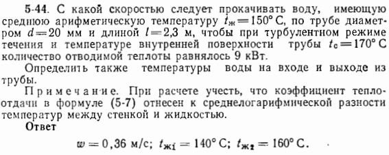 С какой скоростью следует прокачивать воду, имеющую среднюю арифметическую температуру tж=150℃, по трубе диаметром d=20мм и длиной l=2,3м, чтобы при турбулентном режиме течения и температуре внутренней поверхности трубы tc=170℃ количество отводимой теплоты равнялось 9кВт.