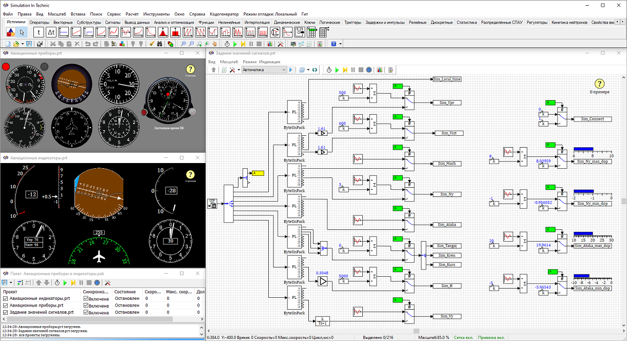 Внимание: данный пример состоит из трех проектов, входящих в состав пакета проектов "Авиационные приборы и индикаторы.pak". Для запуска процесса моделирования необходимо запустить на расчет пакет проектов.