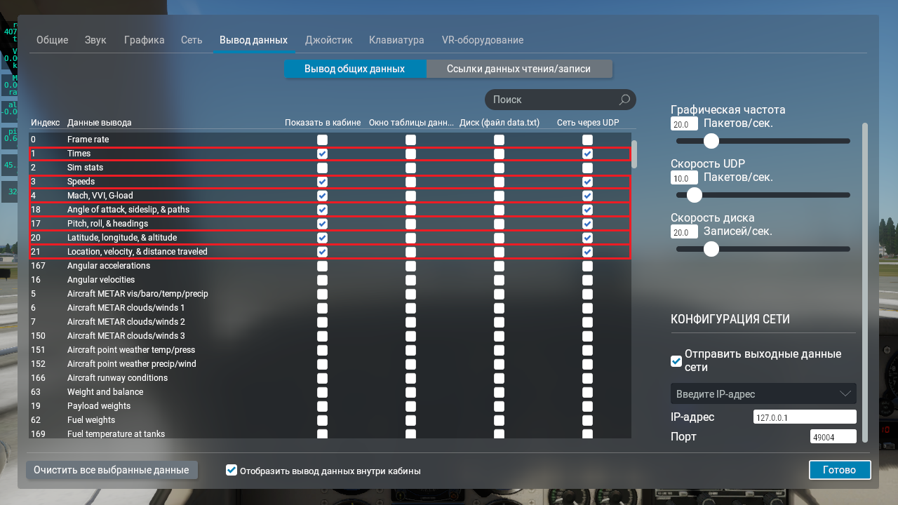 Модель проекта "Задание значений сигналов.prt" настроена на прием от авиасимулятора 11 сигналов (Таблица 1), содержащихся в 7 пакетах данных с индексами 1, 3, 4, 17, 18, 20, 21, которые должны быть отмечены на вкладке "Вывод данных" в окне настроек авиасимулятора X-Plane для отправки данных через сеть на указанный UDP-порт по указанному сетевому адресу (Рисунок 10).