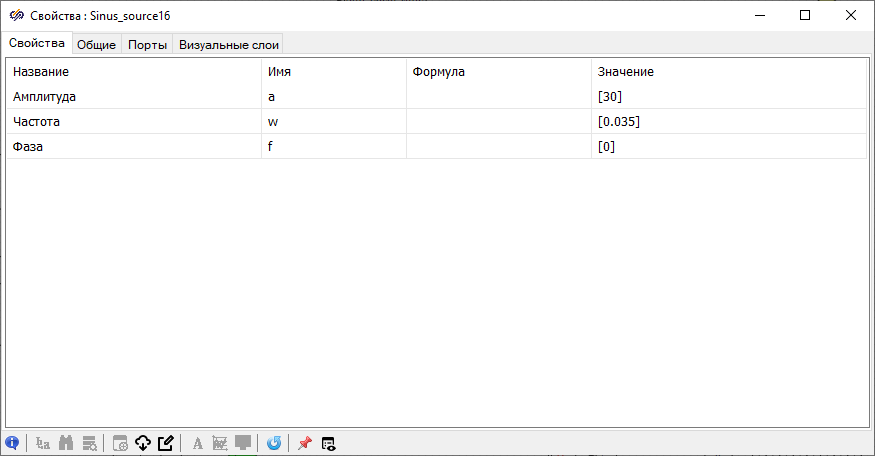 Модель проекта "Авиационные индикаторы.prt" демонстрирует возможности блоков авиационных индикаторов по отображению значений сигналов. В свойствах каждого блока в столбце "Формула" заданы имена сигналов, значения которых влияют на изменение положения подвижных элементов индикации в соответствии с алгоритмами, реализованными внутри блока (Рисунок 4).