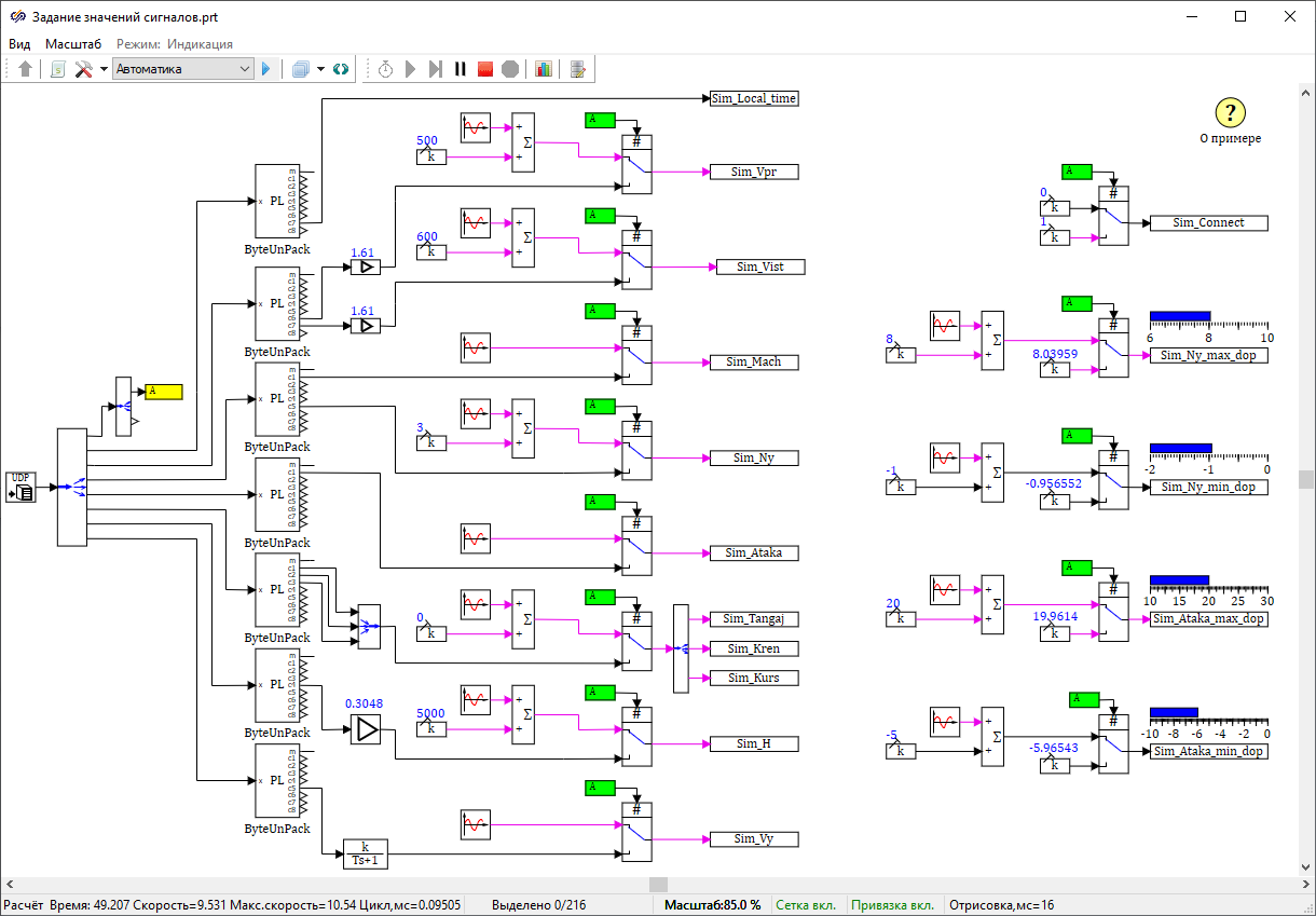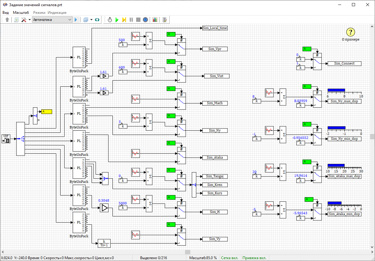 Модель проекта "Задание значений сигналов.prt" имеет два режима работы: Прием данных от авиасимулятора" и Демонстрация".