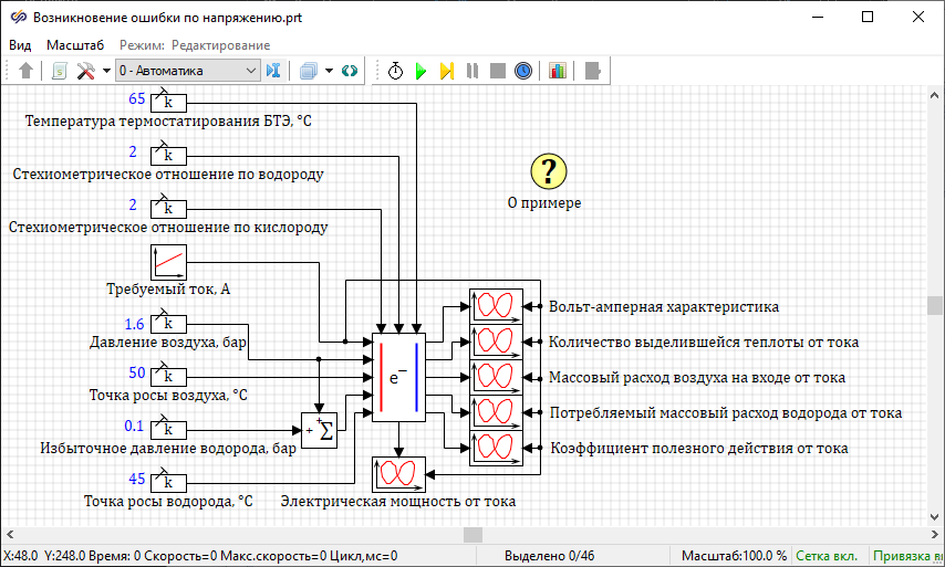 Значения входных портов: точки росы водорода и воздуха равны соответственно 45 °С и 50 °С, давления водорода и воздуха равны соответственно 1.7 бар и 1.6 бар, стехиометрические отношения по водороду и воздуху равны соответственно 1.5 и 2, температура термостатирования БТЭ равна 65 °С.