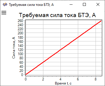 Профиль силы тока представляет собой линейную зависимость от времени от 0 до 300 А (Рис. 2), время расчета равно 10 секундам (рассчитывается до 8.621 с, т.к. пример направлен на демонстрацию ограничений при моделировании БТЭ).