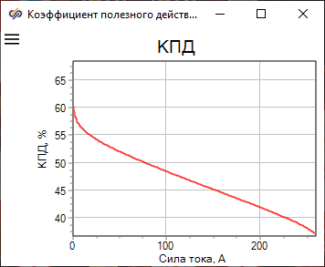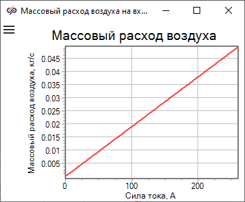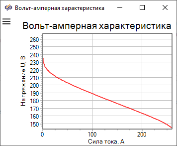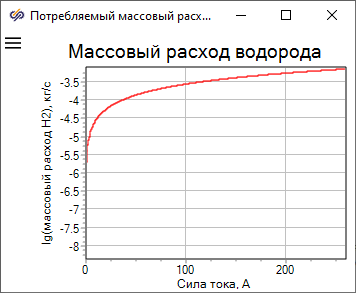 Нужно отметить, что при заданных давлениях и точках росы воздуха и водорода БТЭ не способна генерировать силу тока, большую 258.5 А. Это связано с тем, что напряжение на клеммах БТЭ, приходящееся на один мембранно-электродный блок (МЭБ), не должно составлять менее 0.55 В и быть больше 1.01 В. В данном демо-примере число МЭБ равно 264 (это указано в свойствах блока "Батарея топливных элементов"), поэтому напряжение БТЭ не должно быть меньше 145.2 В.