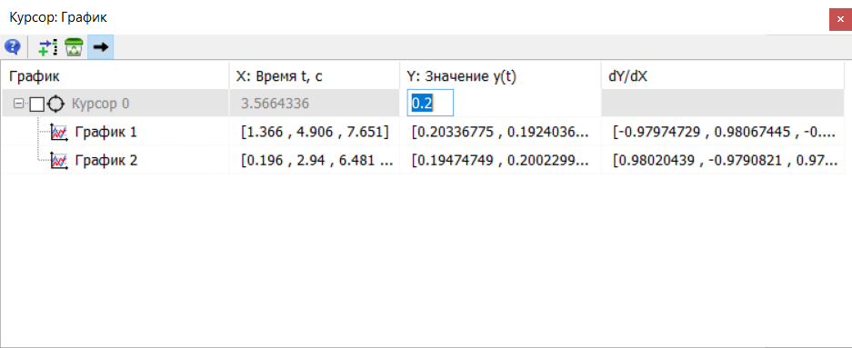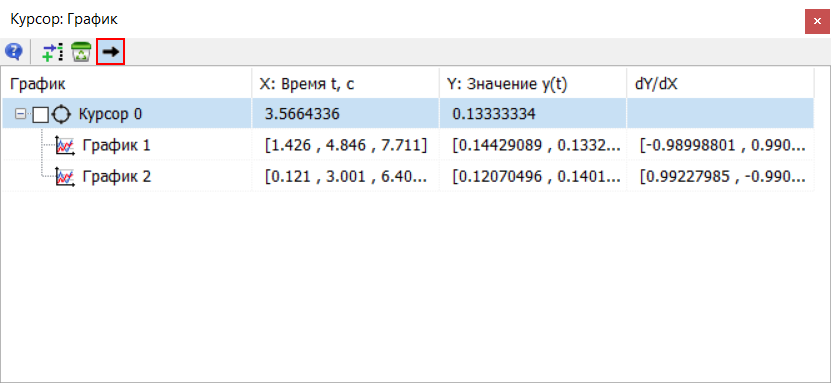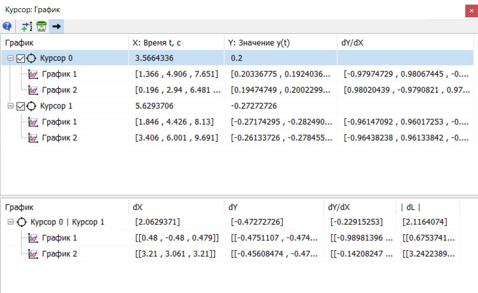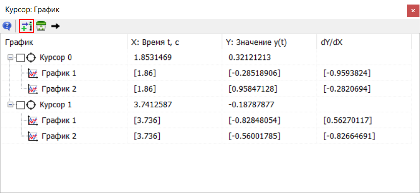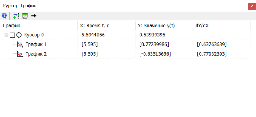 При помощи инструмента "Курсор" осуществляется поиск и вывод в таблицу координат точек пересечения курсора с графиками в вертикальном и горизонтальном направлениях, вычисление производных в данных точках, а также сравнение данных для разных курсоров.