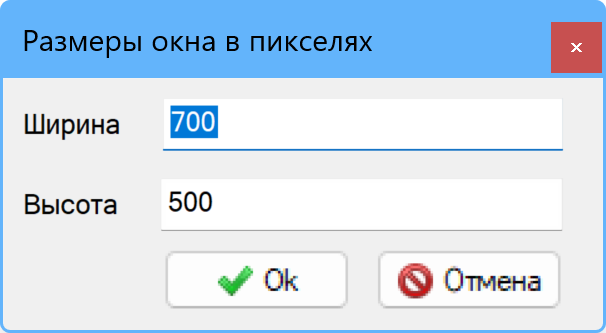 Рис. 2. Окно "Размеры окна в пикселях" - Нажмите "Ok" для сохранения внесенных размеров