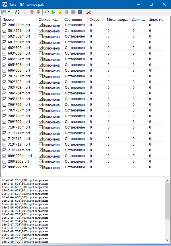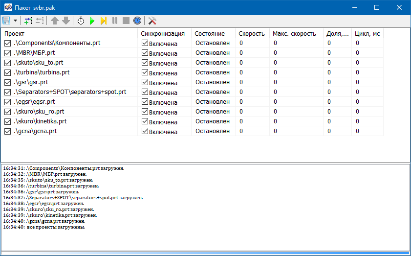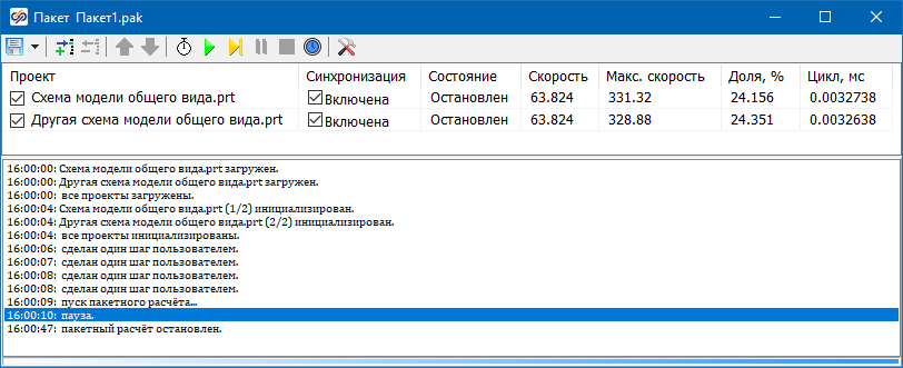 Кнопки быстрого доступа (Рис. 1) содержат кнопку сохранения (файла пакета), кнопки добавления и удаления проекта из пакета, кнопки перемещения вверх-вниз проекта в пакете, а также кнопки управления расчетом, аналогичные кнопкам интерфейса проекта и главного окна. Кроме этого, вынесена кнопка включения-отключения синхронизации с реальным временем и кнопка настроек пакета.