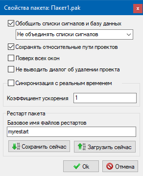 Окно настроек пакета представлено на рисунке Рис. 2. Настройки рестартов описаны в Рестарты проекта и пакета.