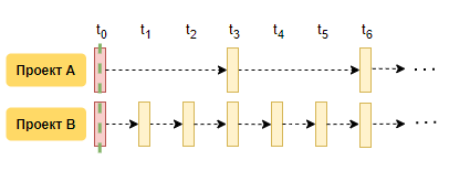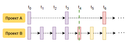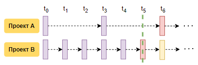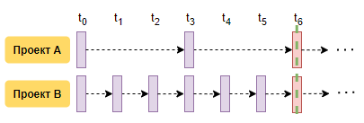 Оба проекта совершают расчет. Проект A досчитывает до времени t6, проект