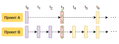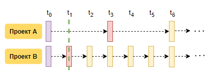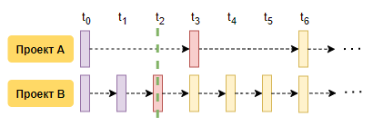 то есть проект A запишет данные, рассчитанные на шаге t3, а проект