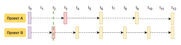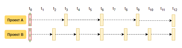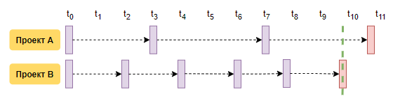 Оба проекта совершают расчет. Проект А совершает расчет до времени t11-Δt
